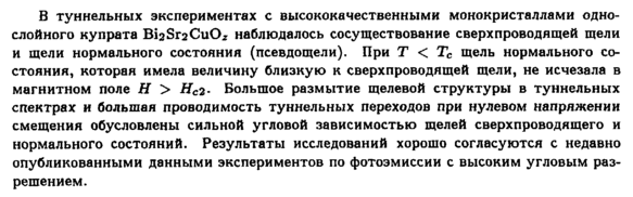 В туннельных экспериментах с высококачественными монокристаллами однослойного купрата BigSraCuO* наблюдалось сосуществование сверхпроводящей щели и щели нормального состояния (псевдощели). При Τ < Тс щель нормального состояния, которая имела величину близкую к сверхпроводящей щели, не исчезала в магнитном поле Η > НС2Большое размытие щелевой структуры в туннельных спектрах и большая проводимость туннельных переходов при нулевом напряжении смещения обусловлены сильной угловой зависимостью щелей сверхпроводящего и нормального состояний. Результаты исследований хорошо согласуются с недавно опубликованными данными экспериментов по фотоэмиссии с высоким угловым разрешением.