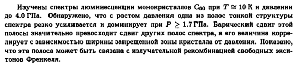 Изучены спектры люминесценции монокристаллов Ceo при Τ Si 10 К и давлении до 4.0 ГПа. Обнаружено, что с ростом давления одна из полос тонкой структуры спектра резко усиливается и доминирует при Ρ > 1.7 ГПа. Барический сдвиг этой полосы значительно превосходит сдвиг других полос спектра, а его величина коррелирует с зависимостью ширины запрещенной зоны кристалла от давления. Показано, что эта полоса может быть связана с излучательной рекомбинацией свободных экси-тонов Френкеля.