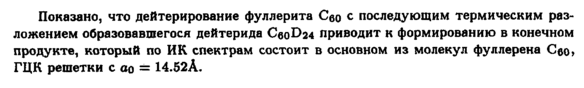 Показано, что дейтерирование фуллерита Ceo с последующим термическим разложением образовавшегося дейтерида CeoD24 приводит к формированию в конечном продукте, который по ИК спектрам состоит в основном из молекул фуллерена Сео> ГЦК решетки с ао = 14.52А.
