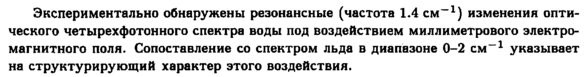 Экспериментально обнаружены резонансные (частота 1.4 см-1) изменения оптического четырехфотонного спектра воды под воздействием миллиметрового электромагнитного поля. Сопоставление со спектром льда в диапазоне 0-2 см"1 указывает на структурирующий характер этого воздействия.