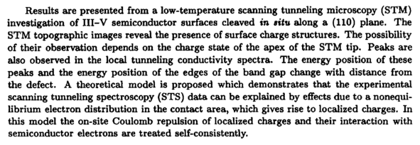 Results are presented from a low-temperature scanning tunneling microscopy (STM) investigation of III-V semiconductor surfaces cleaved in situ along a (110) plane. The STM topographic images reveal the presence of surface charge structures. The possibility of their observation depends on the charge state of the apex of the STM tip. Peaks are also observed in the local tunneling conductivity spectra. The energy position of these peaks and the energy position of the edges of the band gap change with distance from the defect. A theoretical model is proposed which demonstrates that the experimental scanning tunneling spectroscopy (STS) data can be explained by effects due to a nonequi-librium electron distribution in the contact area, which gives rise to localized charges. In this model the on-site Coulomb repulsion of localized charges and their interaction with semiconductor electrons are treated self-consistently.