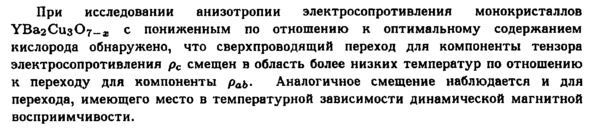 При исследовании анизотропии электросопротивления монокристаллов УВагСизОу-д. с пониженным по отношению к оптимальному содержанием кислорода обнаружено, что сверхпроводящий переход для компоненты тензора электросопротивления рс смещен в область более низких температур по отношению к переходу для компоненты раъ. Аналогичное смещение наблюдается и для перехода, имеющего место в температурной зависимости динамической магнитной восприимчивости.