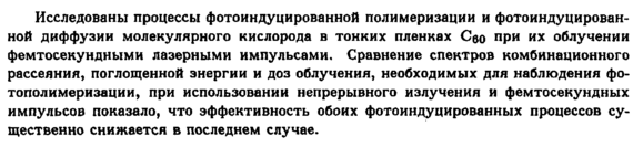 Исследованы процессы фотоиндуцированной полимеризации и фотоиндуцирован-ноЙ диффузии молекулярного кислорода в тонких пленках Ceo при их облучении фемтосекундными лазерными импульсами. Сравнение спектров комбинационного рассеяния, поглощенной энергии и доз облучения, необходимых для наблюдения фотополимеризации, при использовании непрерывного излучения и фемтосекундных импульсов показало, что эффективность обоих фотоиндуцированных процессов существенно снижается в последнем случае.