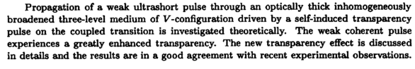 Propagation of a weak ultrashort pulse through an optically thick inhomogeneously broadened three-level medium of V-configuration driven by a self-induced transparency pulse on the coupled transition is investigated theoretically. The weak coherent pulse experiences a greatly enhanced transparency. The new transparency effect is discussed in details and the results are in a good agreement with recent experimental observations.