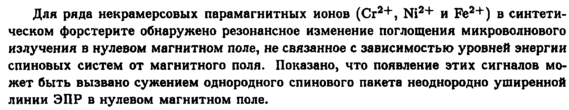 Для ряда некрамерсовых парамагнитных ионов (Cr24*, Ni2+ и Fe2+) в синтетическом форстерите обнаружено резонансное изменение поглощения микроволнового излучения в нулевом магнитном поле, не связанное с зависимостью уровней энергии спиновых систем от магнитного поля. Показано, что появление этих сигналов может быть вызвано сужением однородного спинового пакета неоднородно уширенной линии ЭПР в нулевом магнитном поле.