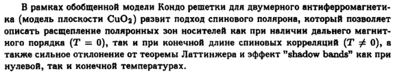 В рамках обобщенной модели Кондо решетки для двумерного антиферромагнетика (модель плоскости СиОа) развит подход спинового полярона, который позволяет описать расщепление поляронных зон носителей как при наличии дальнего магнитного порядка (Т = 0), так и при конечной длине спиновых корреляций (Τ φ 0), а также сильное отклонение от теоремы Латтинжера и эффект "shadow bands'1 как при нулевой, так и конечной температурах.