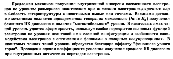 Предложен механизм получения внутризонной инверсии населенности электронов по уровням размерного квантования при инжекции электронно-дырочных пар в t-область гетероструктуры с квантовыми ямами или точками. Важными деталями механизма являются одновременная генерация межзонного (hi/ Eg) излучения ближнего ИК диапазона и наличие "метастабильного" уровня. В квантовых ямах такой уровень удается сформировать, используя слабое перекрытие волновых функций электронов на уровнях квантовой ямы сложной конфигурации и особенности взаимодействия электронов с оптическими фононами в полярных полупроводниках. В квантовых точках такой уровень образуется благодаря эффекту "фононного узкого горла1'. Проведены оценки коэффициента усиления излучения среднего ИК диапазона при внутризонных оптических переходах электронов.