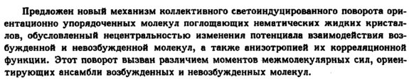 Предложен новый механизм коллективного светоиндуцированного поворота ори-ентационно упорядоченных молекул поглощающих нематических жидких кристаллов, обусловленный нецентральностью изменения потенциала взаимодействия возбужденной и невозбужденной молекул, а также анизотропией их корреляционной функции. Этот поворот вызван различием моментов межмолекулярных сил, ориентирующих ансамбли возбужденных и невозбужденных молекул.