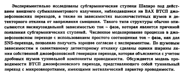 Экспериментально исследованы субгармонические ступени Шапиро под действием внешнего субмиллиметрового излучения, наблюдавшиеся на ΒΑΧ ВТСП джо-зефсоновских переходов, а также на зависимостях высокочастотных шумов и детекторного отклика от напряжения смещения. Такого типа структуры обычно описываются несинусоидальной зависимостью ток фаза, которая является причиной появления субгармонических ступеней. Численное моделирование процессов в джо-зефсоновском переходе с использованием простого соотношения ток фаза, как для SNS-перехода, позволило получить хорошее согласие с экспериментом. По шумовым зависимостям и селективному детекторному отклику сделаны оценки ширины линии собственной джозефсоновской генерации перехода, которая объясняется с учетом дробовых шумов туннельной компоненты проводимости. Обсуждается модель проводимости ВТСП джозефсоновского перехода, представляющего собой туннельный переход с микрозакоротками, имеющими металлический характер проводимости.