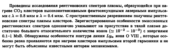 Проведены исследования рентгеновских спектров плазмы, образующейся при нагреве СОз кластеров высокоинтенсивными фемтосекундными лазерными импульсами с λ = 0.8 мкм и λ = 0.4 мкм. С пространственным разрешением получены рентгеновские спектры плазмы кластеров. Зарегистрированные особенности эмиссионных рентгеновских спектров однозначно указывают на присутствие в такой плазме достаточно большого относительного количества ионов (~ 10~2 — 10~3) с энергиями 0.1-1 МэВ. Обнаружены особенности контура линии Lya иона О VIII , которые особенно резко проявляются при нагреве кластеров импульсами второй гармоники и не могут быть объяснены известными авторам механизмами.