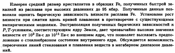 Измерен средний размер кристаллитов в образцах Fe, полученных быстрой закалкой из расплава при высоких давлениях до 95 кбар. Полученные данные позволили оценить барическую зависимость вязкости расплава Fe. Установлен рост вязкости при сжатии вдоль кривой плавления в противоречие с существующими эмпирическими моделями. Экстраполяция полученных барических зависимостей к Ρ,Τ-условиям, соответствующим ядру Земли, дает чрезвычайно высокие значения вязкости от 102 Па-с до 1011 Па-с во внешнем ядре, что позволяет высказать предположение о стеклообразном состоянии внутреннего ядра. Обсуждается возможность . пересечения линий стеклования и плавления веществ в мегабарном диапазоне давлений.