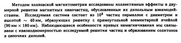Методом холловскоЙ магнитометрии исследованы коллективные эффекты в двумерной решетке магнитных наночастиц, обусловленные их дипольным взаимодействием. Исследуемая система состоит из 106 частиц пермаллоя с диаметром и высотой ~ 40 нм, образующих решетку с прямоугольной элементарной ячейкой (90 нм χ 180 нм). Наблюдающиеся особенности кривых намагничивания мы связываем с квазиодномерностью исследуемой решетки частиц и образованием солитонов в цепочках диполей.