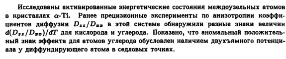 Исследованы активированные энергетические состояния междоузельных атомов в кристаллах α-Ti. Ранее прецизионные эксперименты по анизотропии коэффициентов диффузии Dzz/DxX в этой системе обнаружили разные знаки величин d(Dzz/Dxx)/dT для кислорода и углерода. Показано, что аномальный положительный знак эффекта для атомов углерода обусловлен наличием двухъямного потенциала у диффундирующего атома в седловых точках.