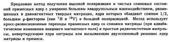 Предложен метод получения высокой поляризации и чистых спиновых состояний примесных ядер с умеренно большим квадрупольным взаимодействием, размещенных в диамагнитных твердых матрицах, ядра которых обладают спином 1/2, большим р-фактором (как ХН и 19F) и большой поляризацией. Метод использует кросс-релаксационные переходы примесных ядер со спинами матрицы (при адиабатическом изменении внешнего магнитного поля) и простые радиочастотные импульсы, инвертирующие ядра матрицы или вызывающие двухспиновый резонанс ядер матрицы и примеси.