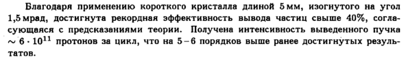 Благодаря применению короткого кристалла длиной 5 мм, изогнутого на угол 1,5мрад, достигнута рекордная эффективность вывода частиц свыше 40%, согласующаяся с предсказаниями теории. Получена интенсивность выведенного пучка ~ б · 1011 протонов за цикл, что на 5-6 порядков выше ранее достигнутых результатов.
