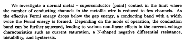 We investigate a normal metal superconductor (point) contact in the limit where the number of conducting channels in the metallic wire is reduced to few channels. As the effective Fermi energy drops below the gap energy, a conducting band with a width twice the Fermi energy is formed. Depending on the mode of operation, the conduction band can be further squeezed, leading to various non-linear effects in the current-voltage characteristics such as current saturation, a N-shaped negative differential resistance, bistability, and hysteresis.