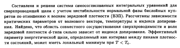 Составлена и решена система самосогласованных интегральных уравнений для сверхпроводящей щели с учетом нестабильности нормальной фазы бислойных куп-ратов по отношению к волнам зарядовой плотности (ВЗП). Рассчитаны зависимости критических параметров от волнового вектора, температуры и индекса допирования. Найдено, что область совместного сосуществования сверхпроводимости и волн зарядовой плотности d-типа сильно зависит от индекса допирования. Эффективный параметр энергетической щели, определяемый как интервал между пиками плотности состояний, может иметь локальный минимум при Τ < Тс.