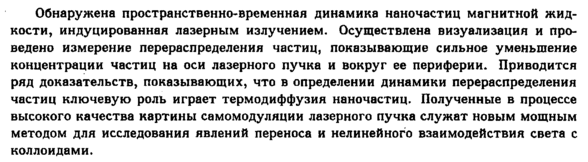 Обнаружена пространственно-временная динамика наночастиц магнитной жидкости, индуцированная лазерным излучением. Осуществлена визуализация и проведено измерение перераспределения частиц, показывающие сильное уменьшение концентрации частиц на оси лазерного пучка и вокруг ее периферии. Приводится ряд доказательств, показывающих, что в определении динамики перераспределения частиц ключевую роль играет термодиффузия наночастиц. Полученные в процессе высокого качества картины самомодуляции лазерного пучка служат новым мощным методом для исследования явлений переноса и нелинейного взаимодействия света с коллоидами.