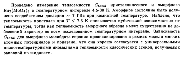 Проведено измерение теплоемкости Ctatai кристаллического и аморфного Еиг(Мо04)з в температурном интервале 4.5-30 К. Аморфное состояние было получено воздействием давления ~ 7 ГПа при комнатной температуре. Найдено, что теплоемкость кристалла при Τ < 7.5 К описывается кубической зависимостью от температуры, тогда как теплоемкость аморфного образца имеет существенно не де-баевский характер во всем исследованном температурном интервале. Зависимость Ctotai Для аморфного молибдата европия проанализирована в рамках модели мягких атомных потенциалов и показано, что она хорошо согласуется с универсальными низкотемпературными аномалиями теплоемкости классических стекол, получаемых закалкой из жидкости.