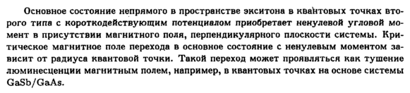 Основное состояние непрямого в пространстве экситона в квантовых точках второго типа с короткодействующим потенциалом приобретает ненулевой угловой момент в присутствии магнитного поля, перпендикулярного плоскости системы. Критическое магнитное поле перехода в основное состояние с ненулевым моментом зависит от радиуса Квантовой точки. Такой переход может проявляться как тушение люминесценции магнитным полем, например, в квантовых точках на основе системы GaSb/GaAs.
