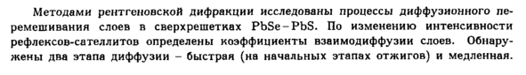 Методами рентгеновской дифракции исследованы процессы диффузионного перемешивания слоев в сверхрешетках PbSe PbS. По изменению интенсивности рефлексов-сателлитов определены коэффициенты взаимодиффузии слоев. Обнаружены два этапа диффузии быстрая (на начальных этапах отжигов) и медленная.