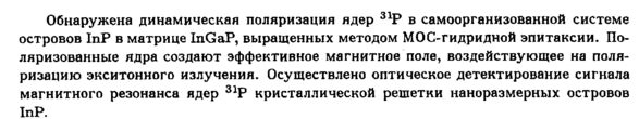 Обнаружена динамическая поляризация ядер 31Р в самоорганизованной системе островов InP в матрице InGaP, выращенных методом МОС-гидридной эпитаксии. Поляризованные ядра создают эффективное магнитное поле, воздействующее на поляризацию экситонного излучения. Осуществлено оптическое детектирование сигнала магнитного резонанса ядер 31Р кристаллической решетки наноразмерных островов InP.