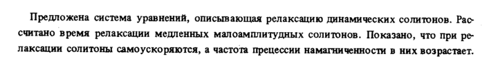 Предложена система уравнений, описывающая релаксацию динамических солитонов. Рассчитано время релаксации медленных малоамплитудных солитонов. Показано, что при релаксации солитоны самоускоряются, а частота прецессии намагниченности в них возрастает.