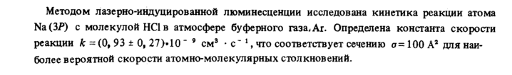 Методом лазерно-индуцированной люминесценции исследована кинетика реакции атома Na(3P) с молекулой НС1 в атмосфере буферного газа.Аг. Определена константа скорости реакции к = (0, 93 ± 0, 27)· 10 " 9 см3 · с~ 1, что соответствует сечению σ = 100 А2 для наиболее вероятной скорости атомно-молекулярных столкновений.