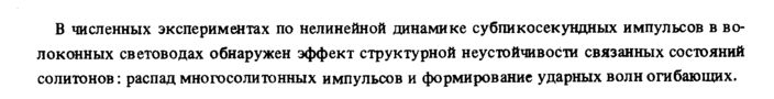 В численных экспериментах по нелинейной динамике субпикосекундных импульсов в волоконных световодах обнаружен эффект структурной неустойчивости связанных состояний солитонов: распад много со ли тонных импульсов и формирование ударных волн огибающих.