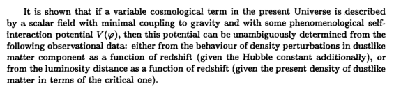 It is shown that if a variable cosmological term in the present Universe is described by a scalar field with minimal coupling to gravity and with some phenomenological self-interaction potential V(ip), then this potential can be unambiguously determined from the following observational data: either from the behaviour of density perturbations in dustlike matter component as a function of redshift (given the Hubble constant additionally), or from the luminosity distance as a function of redshift (given the present density of dustlike matter in terms of the critical one).