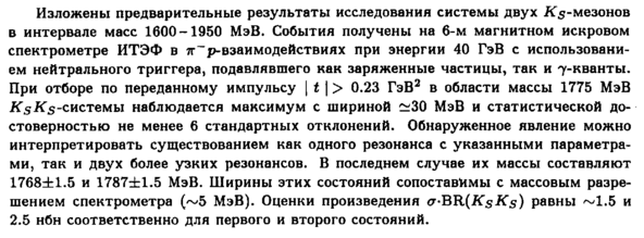 Изложены предварительные результаты исследования системы двух ifs-мезонов в интервале масс 1600-1950 МэВ. События получены на 6-м магнитном искровом спектрометре ИТЭФ в я--р-взаимодействиях при энергии 40 ГэВ с использованием нейтрального триггера, подавлявшего как заряженные частицы, так и 7-кванты. При отборе по переданному импульсу | ί | > 0.23 ГэВ2 в области массы 1775 МэВ Ksifs-системы наблюдается максимум с шириной ~30 МэВ и статистической достоверностью не менее 6 стандартных отклонений. Обнаруженное явление можно интерпретировать существованием как одного резонанса с указанными параметрами, так и двух более узких резонансов. В последнем случае их массы составляют 1768±1.5 и 1787±1.5 МэВ. Ширины этих состояний сопоставимы с массовым разрешением спектрометра (~5 МэВ). Оценки произведения a-BK(KsKs) равны ~1.5 и 2.5 нбн соответственно для первого и второго состояний.