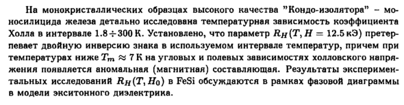 На монокристаллических образцах высокого качества "Кондо-изолятора" моносилицида железа детально исследована температурная зависимость коэффициента Холла в интервале 1.8-f 300К. Установлено, что параметр Rh(T>H — 12.5кЭ) претерпевает двойную инверсию знака в используемом интервале температур, причем при температурах ниже Тт & 7 К на угловых и полевых зависимостях холловского напряжения появляется аномальная (магнитная) составляющая. Результаты экспериментальных исследований Яя(Т, Но) в FeSi обсуждаются в рамках фазовой диаграммы в модели экситонного диэлектрика.