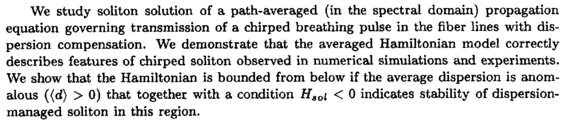 We study soliton solution of a path-averaged (in the spectral domain) propagation equation governing transmission of a chirped breathing pulse in the fiber lines with dispersion compensation. We demonstrate that the averaged Hamiltonian model correctly describes features of chirped soliton observed in numerical simulations and experiments. We show that the Hamiltonian is bounded from below if the average dispersion is anomalous ((d) > 0) that together with a condition Haoi < 0 indicates stability of dispersion-managed soliton in this region.