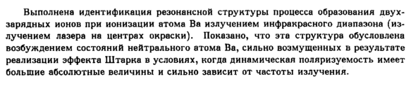 Выполнена идентификация резонансной структуры процесса образования двух-зарядных ионов при ионизации атома 6а излучением инфракрасного диапазона (излучением лазера на центрах окраски). Показано, что эта структура обусловлена возбуждением состояний нейтрального атома Ва, сильно возмущенных в результате реализации эффекта Штарка в условиях, когда динамическая поляризуемость имеет большие абсолютные величины и сильно зависит от частоты излучения.