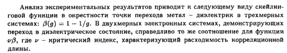 Анализ экспериментальных результатов приводит к следующему виду скейлин-говой функции в окрестности точки перехода метал диэлектрик в трехмерных системах: β{ρ) — 1 — 1/д. В двухмерных электронных системах, демонстрирующих переход в диэлектрическое состояние, справедливо то же соотношение для функции Ф'/З, где и критический индекс, характеризующий расходимость корреляционной длины.
