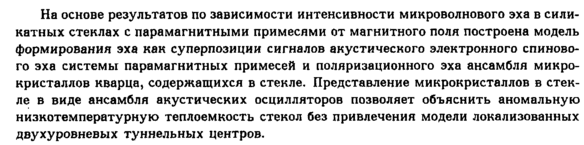 На основе результатов по зависимости интенсивности микроволнового эха в силикатных стеклах с парамагнитными примесями от магнитного поля построена модель формирования эха как суперпозиции сигналов акустического электронного спинового эха системы парамагнитных примесей и поляризационного эха ансамбля микрокристаллов кварца, содержащихся в стекле. Представление микрокристаллов в стекле в виде ансамбля акустических осцилляторов позволяет объяснить аномальную низкотемпературную теплоемкость стекол без привлечения модели локализованных двухуровневых туннельных центров.