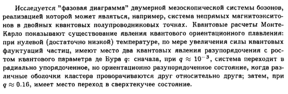 Исследуется "фазовая диаграмма" двумерной мезоскопической системы бозонов, реализацией которой может являться, например, система непрямых магнитоэксито-нов в двойных квантовых полупроводниковых точках. Квантовые расчеты Монте-Карло показывают существование явления квантового ориентационного плавления: при нулевой (достаточно низкой) температуре, по мере увеличения силы квантовых флуктуаций частиц, имеют место два квантовых явления разупорядочения с ростом квантового параметра де Бура q: сначала, при q та 10_3, система переходит в радиально упорядоченное, но ориентационно разупорядоченное состояние, когда различные оболочки кластера проворачиваются друг относительно друга; затем, при q 0.16, имеет место переход в сверхтекучее состояние.