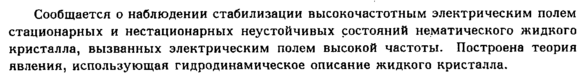Сообщается о наблюдении стабилизации высокочастотным электрическим полем стационарных и нестационарных неустойчивых состояний нематического жидкого кристалла, вызванных электрическим полем высокой частоты. Построена теория явления, использующая гидродинамическое описание жидкого кристалла.