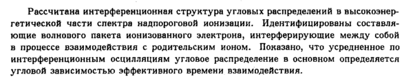 Рассчитана интерференционная структура угловых распределений в высокоэнергетической части спектра надпороговой ионизации. Идентифицированы составляющие волнового пакета ионизованного электрона, интерферирующие между собой в процессе взаимодействия с родительским ионом. Показано, что усредненное по интерференционным осцилляциям угловое распределение в основном определяется угловой зависимостью эффективного времени взаимодействия.
