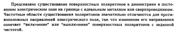 Предсказано существование поверхностных поляритонов в диэлектрике в постоянном электрическом поле на границе с идеальным металлом или сверхпроводником. Частотные области существования поляритонов значительно отличаются для противоположных направлений электрического поля, так что изменение его направления означает "включение" или "выключение" поверхностных поляритонов с заданной частотой.