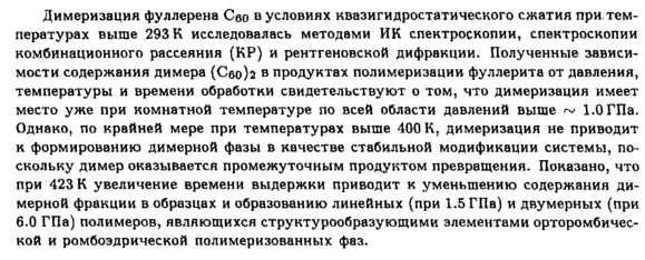 Димеризация фуллерена Ceo в условиях квазигидростатического сжатия при температурах выше 293 К исследовалась методами ИК спектроскопии, спектроскопии комбинационного рассеяния (КР) и рентгеновской дифракции. Полученные зависимости содержания димера (Сво)г в продуктах полимеризации фуллерита от давления, температуры и времени обработки свидетельствуют о том, что димеризация имеет место уже при комнатной температуре по всей области давлений выше ~ 1.0 ГПа. Однако, по крайней мере при температурах выше 400 К, димеризация не приводит к формированию димерной фазы в качестве стабильной модификации системы, поскольку димер оказывается промежуточным продуктом превращения. Показано, что при 423 К увеличение времени выдержки приводит к уменьшению содержания димерной фракции в образцах и образованию линейных (при 1.5 ГПа) и двумерных (при 6.0 ГПа) полимеров, являющихся структурообразующими элементами орторомбичес-кой и ромбоэдрической полимеризованных фаз.