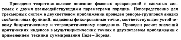 Проведено теоретико-полевое описание фазовых превращений в сложных системах с двумя взаимодействующими параметрами порядка. Непосредственно для трехмерных систем в двухпетлевом приближении проведен ренорм-групповой анализ скейлинговых функций, выделены фиксированные точки, соответствующие устойчивому бикритическому и тетракритическому поведению. Проведен расчет значений критических индексов в мультикритических точках в двухпетлевом приближении с применением техники суммирования Паде-Бореля.