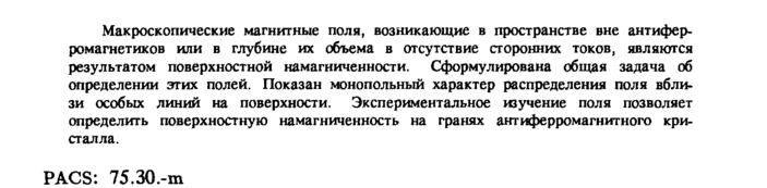 Макроскопические магнитные поля, возникающие в пространстве вне антиферромагнетиков или в глубине их объема в отсутствие сторонних токов, являются результатом поверхностной намагниченности. Сформулирована общая задача об определении этих полей. Показан монопольный характер распределения поля вблизи особых линий на поверхности. Экспериментальное изучение поля позволяет определить поверхностную намагниченность на гранях антиферромагнитного кристалла. Ρ ACS: 75.30.-m