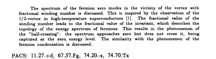 The spectrum of the fermion zero modes in the vicinity of the vortex with fractional winding number is discussed. This is inspired by the observation of the 1/2-vortex in high-temperature superconductors [I]. The fractional value of the winding number leads to the fractional value of the invariant, which describes the topology of the energy spectrum of fermions. This results in the phenomenon of the "half-crossing": the spectrum approaches zero but does not cross it, being captured at the zero, energy level. The similarity with the phenomenon of the fermion condensation is discussed. PACS: 11.27.+d, 67.57.Fg, 74.20.-z, 74.70.Tx