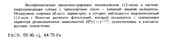 Экспериментально продемонстрировано возникновение 1//-шума в системе: сверхпроводящая пленка с транспортным током ~ кипящий жидкий охладитель. Обнаружена широкая область параметров, в которых наблюдается широкополосный 1//-шум с большим размахом флуктуации, который связывается с совпадением характера релаксационных зависимостей ST{t) ~ £~~1//2, существующих в контактирующих подсистемах. PACS; 05.40.-j-j, 64.70.Fx