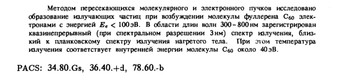 Методом пересекающихся молекулярного и электронного пучков исследовано образование излучающих частиц при возбуждении молекулы фуллерена Сбо электронами с энергией Ее < 100эВ. В области длин волн 300 800 нм зарегистрирован квазинепрерывный (при спектральном разрешении Знм) спектр излучения, близкий к планковскому спектру излучения нагретого тела. При этом температура излучения соответствует внутренней энергии молекулы С^о около 40 эВ. PACS: 34.80.Gs, 36.40.-fd, 78.60.-b