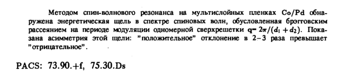 Методом спин-волнового резонанса на мультислойных пленках Co/Pd обнаружена энергетическая щель в спектре спиновых волн, обусловленная брэгговским рассеянием на периоде модуляции одномерной сверхрешетки q2π/(<ί| +di)Показана асимметрия этой щели: "положительное" отклонение в 2-3 раза превышает "отрицательное". PACS: 73.90.+f, 75.30.Ds
