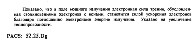 Показано, что в поле мощного излучения электронная сила трения, обусловленная столкновениями электронов с ионами, становится силой ускорения электронов благодаря поглощению электронами энергии излучения. Указано на увеличение теплопроводности. Ρ ACS: 52.25.Dg