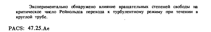 Экспериментально обнаружено влияние вращательных степеней свободы на критическое число Рейнольдса перехода к турбулентному режиму при течении в круглой трубе.