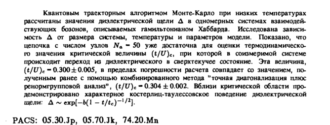 Квантовым траекторным алгоритмом Монте-Карло при низких температурах рассчитаны значения диэлектрической щели Δ в одномерных системах взаимодействующих бозонов, описываемых гамильтонианом Хаббарда. Исследована зависимость Δ от размера системы, температуры и параметров модели. Показано, что цепочка с числом узлов JVa ~ 50 уже достаточна для оценки термодинамического значения критической величины (t/(7)c, при которой в соизмеримой системе происходит переход из диэлектрического в сверхтекучее состояние. Эта величина, {t/U)c ~ 0.300 ± 0.005, в пределах погрешности расчета совпадает со значением, полученным ранее с помощью комбинированного метода "точная диагонализация плюс ренормгрупповой анализ", (t/U)c ~ 0.304 ± 0.002. Вблизи критической области продемонстрировано характерное костерлиц-таулессовское поведение диэлектрической щели: Δ ~ ехр[-Ь(1 t/te)~'/2]. PACS: 05.30.Jp, 05.70.Jk, 74.20.Mn